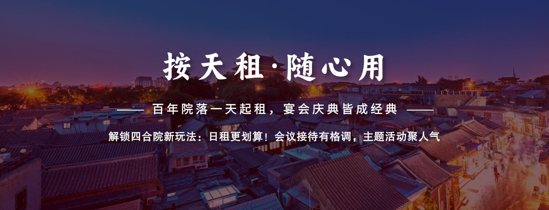 北京一五七信息咨询有限公司旗下的共享四合院网站,专注于打造高端四合院日租服务品牌。公司依托百余套稀缺四合院资源(面积100-1000㎡),深度布局北京二环内东、西城区核心地段,涵盖前门、琉璃厂、南锣鼓巷、王府井等文化地标区域,以“传承京韵·定制雅集”为核心理念,为高端商务接待、文化沙龙、影视拍摄、主题宴请等场景提供兼具...